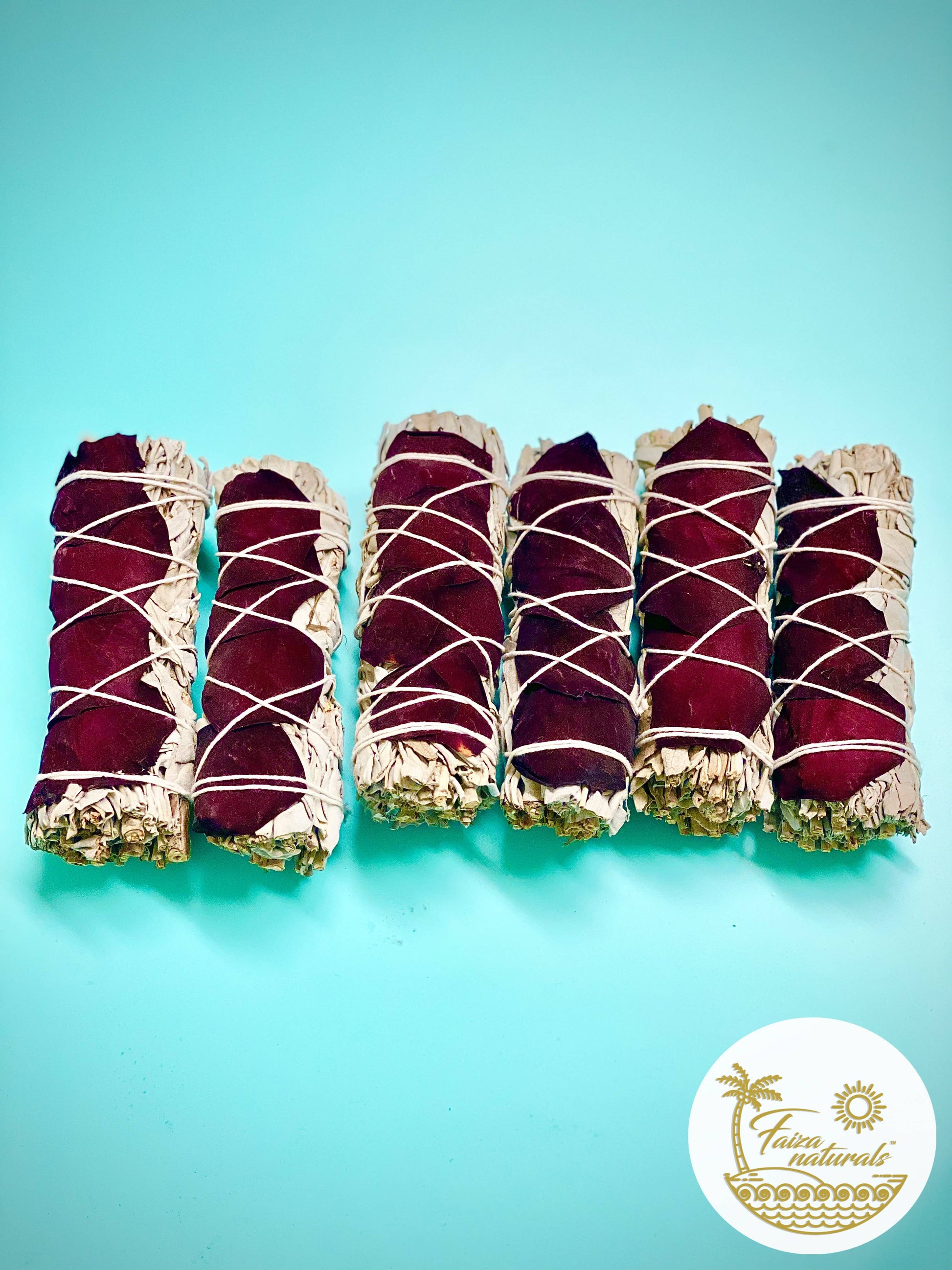 Premium quality hand-harvested and hand-tied California white sage bundles/smudge sticks (4 inch) with organic Rose Petals.